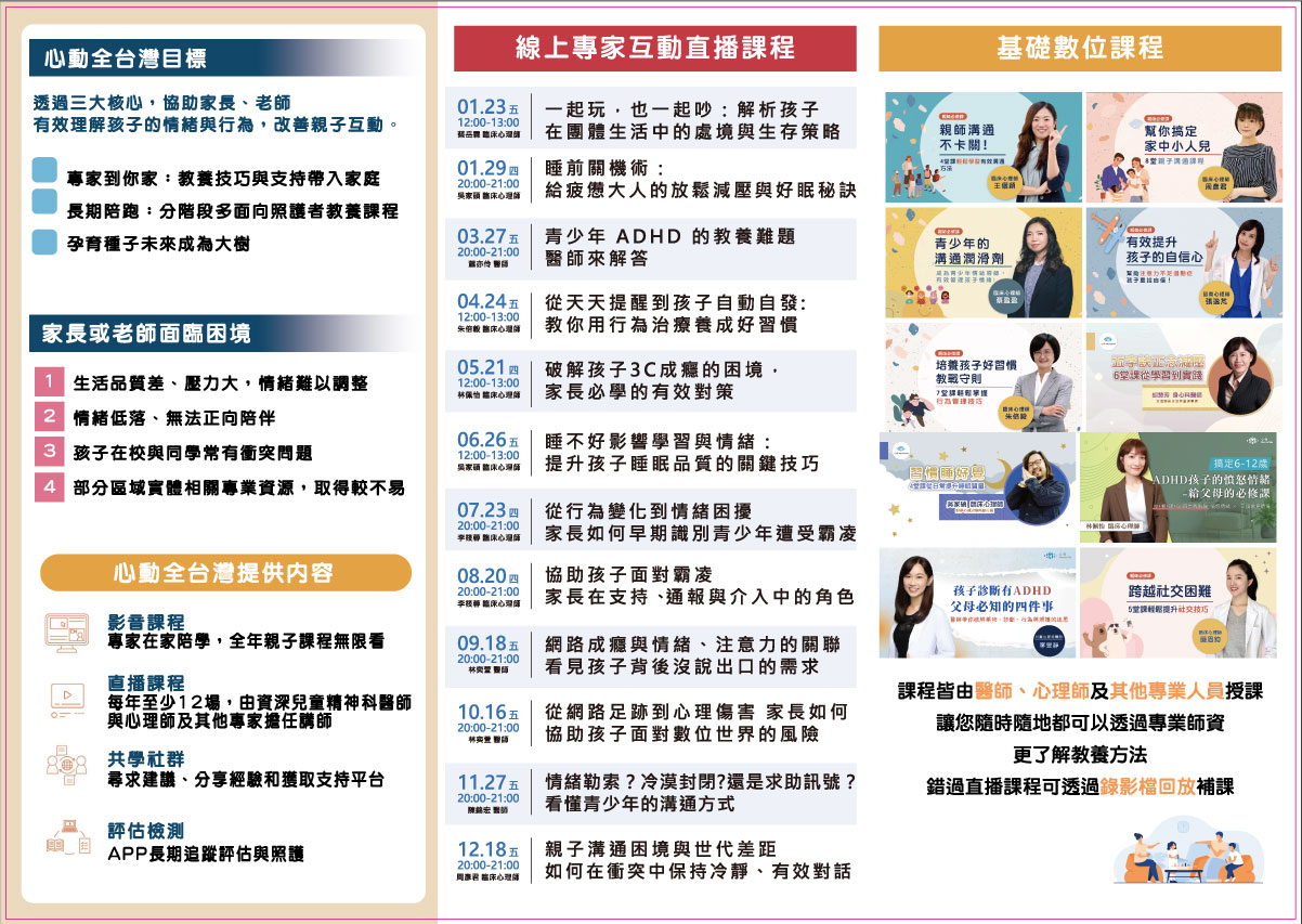 本方案課程由兒童心智科醫師、臨床心理師、職能治療師等專家群共同規劃數位影音課程、專家直播課程等,詳如附件。 |