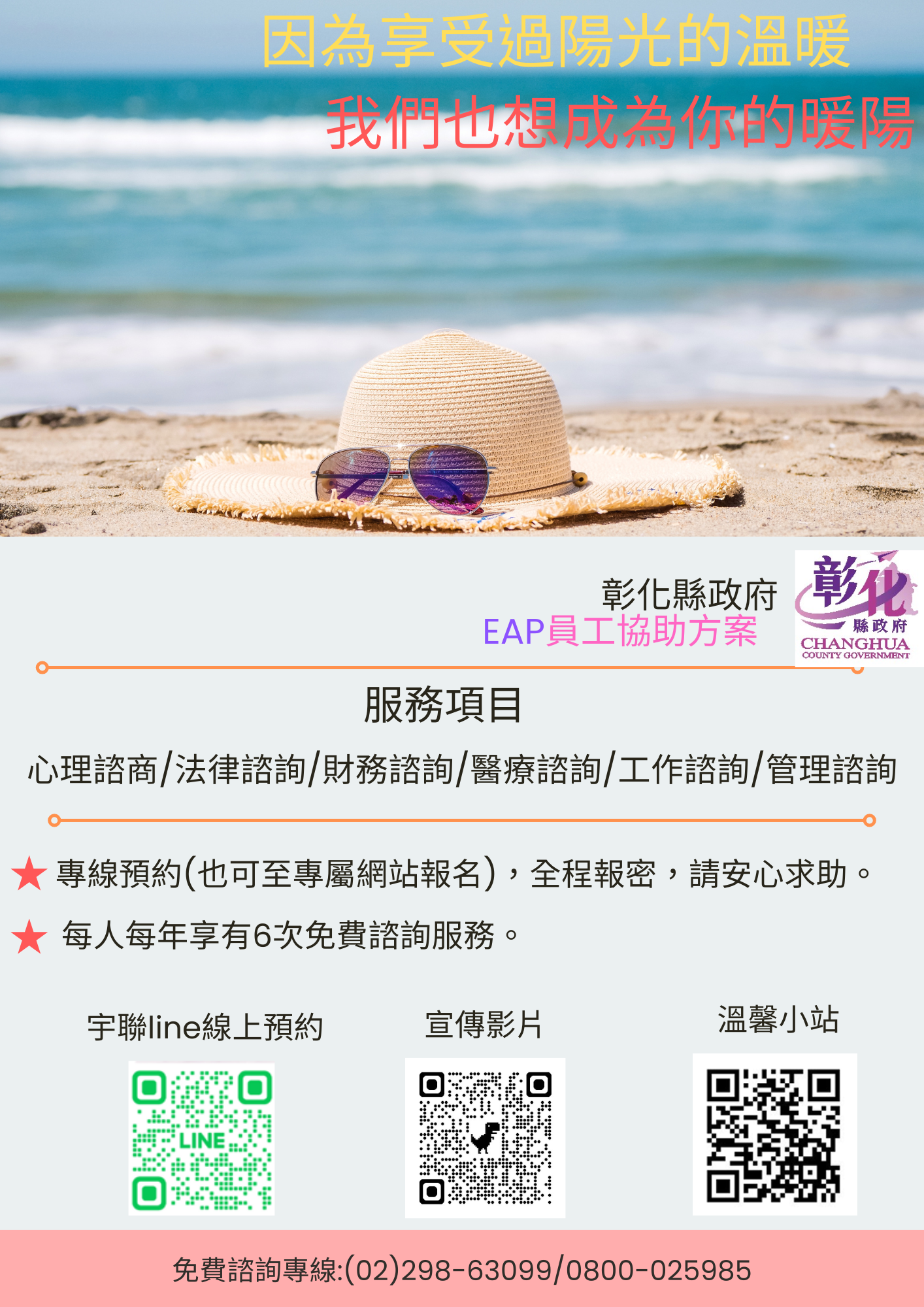 為營造友善職場環境並促進同仁身心健康,本府員工協助 方案(EAP)提供多元專業諮詢服務,請查照並轉知所屬 同仁。